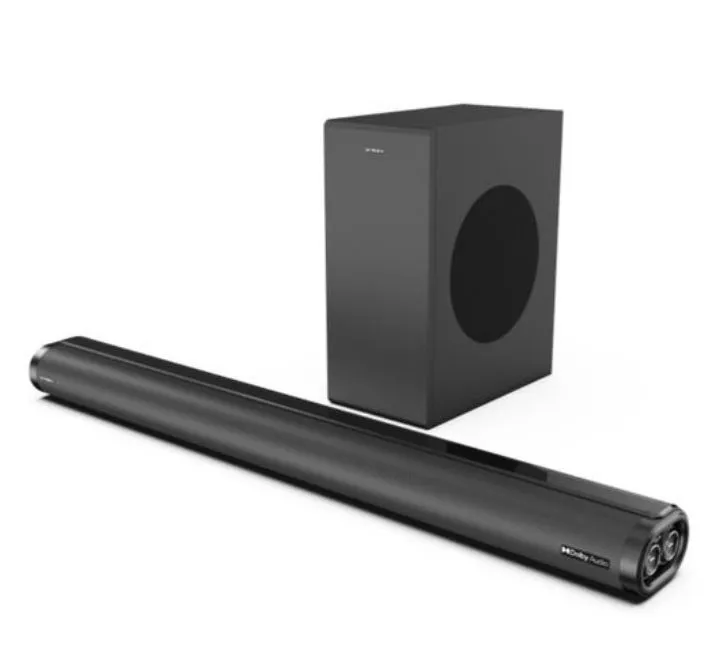 The soundbar features a sleek, minimalist design with a durable plastic casing that complements modern interiors. An integrated LED display provides clear visual feedback on volume levels, input sources, and connection status, making operation intuitive and straightforward.
